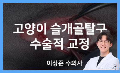 고양이 슬개골 탈구의 수술적 교정 증례고양이 슬개골 탈구의 수술적 교정 증례■ 환자 기본 정보동물 이름 : 진순나이 : 9살성별 : 중성화 남품종 : 러시안 블루주요 증상 : 후지 다리 불편감 및 운동량 감소■ 내원 당시 환자의 상태9살 중성화 수컷 러시안 블루 진순이는 약 4~5년 전부터 지속적인 후지 불편 증상을 보여왔습니다.주로 해먹이나 계단 등 높은 곳에서 내려온 이후 뒷다리를 덜 사용하거나 움츠리는 행동이 반복적으로 관찰되었으며, 이러한 증상을 주소로 본원에 내원하였습니다.■ 검사 방법 및 결과신체검사 및 혈액검사 : 체중은 5.8kg에 고양이의 비만도를 평가할 수 있는 BCS(Body condition score)는 9중 7 정도로 과체중 상태였습니다. 혈액검사 상에서는 전혈구 검사(CBC), 혈액화학검사, 혈액가스검사 모두 특이사항은 없었습니다.정형검사 : 정형검사 상 양측 슬개골 내측 탈구가 확인되었으며, 양측 모두 인위적인 환납은 가능하지만 슬개골이 탈구된 상태인 Grade 3로 확인되었습니다.방사선 검사 : 후지 방사선 상 복배상(VD view)에서는 양측 슬개골이 활차구 내 위치하지 않고 내측으로 변위되어 있는 모습을 확인할 수 있었습니다. 또한 양쪽 무릎관절 전반에 걸쳐 골극(Osteophyte) 형성, 관절 내 삼출액 등 퇴행성 관절염 소견이 확인되었습니다. ▼관절액 검사: 영상 검사에서 확인된 무릎 관절의 퇴행성 변화 및 관절염 소견을 근거로, 관절염의 성격을 파악하기 위해 관절액 검사를 진행하였습니다.관절액 검사 결과, 관절액의 점도는 양호하게 유지되고 있었지만, 세포 검사에서 단핵구(Monocyte)가 주로 관찰되었으며, 이는 만성적인 골관절염이나 퇴행성 변화 등에서나타날 수 있는 백혈구의 한 종류입니다.▼진단결과 : 병력과 검사결과를 종합하여, 진순이는 장기간에 걸쳐 발생한 만성적인 슬개골 내측 탈구로 인해 이차적으로 퇴행성 관절염이 발생한 것으로 진단되었습니다.특히, 슬개골 탈구는 불편감을 호소하는 등의 증상을 동반하고 있으며, 수술이 지시되는 단계인 3기로 확인되었기 때문에 수술적 교정을 진행하는 것으로 결정하였습니다.■ 수술 / 치료 방법철수는 양측 슬개골 탈구로 인한 중등도 이상의 관절염이 확인되었으며, 실제로 절개 후 관절면을 확인하였을 때 가골이 형성되어 있는 모습을 확인할 수 있었습니다. ▼이에 대해서 슬개골의 정상 위치 복원과 함께 관절 기능의 개선을 목표로 총 4단계의 수술적 교정을 진행하였습니다.우선 첫번째로, 슬개골이 안착하는 홈인 활차구를 사각형 형태로 파내는 TBR(Trochlear block recession) 기법을 적용하여 슬개골이 안정적으로 위치할 수 있도록 하였습니다. 단, 고양이는 개와 달리 슬개골 형태가 넓기 때문에 홈을 깊게 조성할 경우 제자리에 잘 삽입되지 않거나 관절면이 손상될 수 있기 때문에 이러한 해부학적 특성을 고려하여 홈을 너무 깊지 않게 조성해주었습니다. ▼다음으로, 철수의 경우 슬개골이 만성적으로 내측으로 탈구되어있는 상태였기 때문에 이를 바로잡기 위해 슬개골 주변 연부조직의 균형을 조정해주는 두 단계의 수술적 절차를 함께 진행해주었습니다.먼저, 슬개골을 안쪽으로 당기고 있던 조직은 절개해서 풀어주고, 반대로 느슨해져있는 외측 조직은 봉합하여 당겨주는 방식으로 슬개골이 제 위치에 있을 수 있도록 균형을 맞춰주었습니다.이후 슬개골 인대가 부착되는 경골조면을 절골하여 바깥쪽으로 옮긴 뒤 핀으로 고정하는 TTT(Tibial tuberosity Transposition) 기법을 사용하여 근육 및 인대의 정렬을 조정해주었습니다. 마지막으로, 관절 내 윤활역할을 통해 염증 및 통증을 완화하고, 연골 보호 효과를 기대할 수 있도록 애니콘주를 관절 내로 주사한 후 수술을 마무리하였습니다. ▼■ 수술 / 치료 경과수술 직후 방사선 검사 상에서도 슬개골이 고랑 내에 잘 위치하고 있으며, 골편을 고정시키기 위한 핀도 잘 삽입되어있는 모습을 확인할 수 있었습니다.진순이는 수술 후 2일차부터 체중지지와 함께 천천히 보행을 시작하였으며, 수술 부위도 부종이나 삼출물 등 이상소견 없이 양호했습니다.수술 후 5일차에 식욕, 활력, 보행양상 모두 양호하여 퇴원을 결정하였습니다.이후 수술 후 2주차 재진 시 수술 전 보였던 다리가 휘는 느낌이 소실되었으며, 양측 슬개골 탈구도 확인되지 않았습니다.또한 수술 후 4주차 재진 시에는 운동량 및 활동성도 눈에 띄게 개선되었으며, 보호자분의 만족도도 매우 높았습니다.이후 모니터링에서 근육량 증가와 함께 슬개골 탈구도 재발 없이 현재까지 잘 유지되고 있습니다. ▼고양이 슬개골 탈구는 무릎 관절 내 슬개골이 정상 위치에서 벗어나 주로 안쪽(내측)으로 탈구되는 질환으로, 개에 비해서는 드물게 나타나지만 발생할 경우 파행이나 통증, 불편감을 유발하고, 시간이 지나면서 퇴행성 관절염과 함께 근육량 감소를 유발할 수 있습니다.특히 고양이는 통증을 잘 숨기는 특성을 가지고 있기 때문에 슬개골 탈구가 상당히 진행될 때 까지 보호자가 눈치채지 못하는 경우도 많습니다.철수와 같이 슬개골 탈구 3기 이상의 경우에는 보존적인 관리만으로는 교정이 어려우며, 활발히 