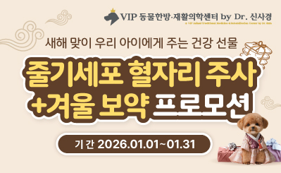 'VIP동물한방•재활의학센터 by Dr. 신사경'에서 줄기세포 혈자리 주사+겨울 보약 1월 프로모션을 진행합니다!■ 기간 : 2026.01.01~01.31■ 금액 : 435,000원 > 330,000원 (15kg 기준)줄기세포 혈자리 주사란?√ 관절 주변 조직 및 손상된 연골 재생에 효과적√노령성 질환 및 노화 방지√입원∙재활이 필요 없는 빠르고 효과적인 치료√침치료 인증 수의사(CVA)가 직접 진행+겨울 보약 3종(택1)√ 원기회복√ 면역증진√ 관절튼튼■ 상담 및 예약 문의 대표전화 : 02.6952.7524카카오채널 : VIP동물한방 재활의학센터_신사경