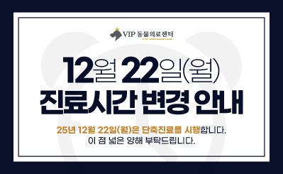 12월 22일(월) 진료시간 변경 안내어느덧 2025년의 끝자락, 따뜻한 연말이 찾아왔습니다.VIP동물의료센터의 임직원이 한자리에 모여다가오는 2026년, 붉은 말의 해를 힘차게 맞이할 준비를 하기 위해12월 22일(월)은 아래와 같이 단축진료를 시행합니다.●청담점∙성북점∙동대문점∙노원점∙서초점-예약 마감 16시-진료 마감 17시-야간진료(19~22시): 성북점, 동대문점, 노원점 (노원점은 응급실만 운영)-심야응급(22시~): 정상 운영●한방재활의학센터 by Dr.신사경-예약 마감 16시-진료 마감 16시 30분진료시간 변경에 대한 넓은 양해 부탁드리며,늘 보내주시는 믿음과 응원에 힘입어2026년에도 더욱 진심어린 진료로 보답하겠습니다!반려동물과 함께 올 한 해 따뜻하게 마무리하시고,평안하고 행복한 연말 보내세요 : )
