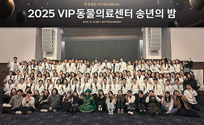 12/22(월) 보테가마지오 연회장에서 VIP동물의료센터 전직원 임직원들이 한 자리에 모인 '2025 송년의 밤' 행사가 성황리에 개최되었습니다.이번 행사는 올 한 해 동안 현장에서 묵묵히 최선을 다해준 전 지점(청담점·동대문점·성북점·노원점·서초점·한방재활센터by.Dr.신사경) 구성원의 노고를 치하하고,다가오는 2026년의 새로운 도약을 다짐하기 위해 마련되었습니다.■ 성장의 주역들을 위한 격려와 시상이 날 행사에서는 2025년 한 해 동안 환자와 보호자를 위해 헌신한 지점별 우수사원 시상식이 진행되었습니다. 각 지점 원장님들께서 직접 상장과 꽃다발을 전달해 주시며 그동안의 노력과 헌신에 진심 어린 감사의 마음을 전했습니다.청담점 성북점동대문점서초점노원점한방재활센터 by.Dr.신사경■ 300여 명의 임직원이 하나가 된 화합의 장지점 간의 벽을 허무는 열정적인 레크리에이션과 더불어, 올해의 드레스코드인 ‘글리터룩’ 베스트 드레서 시상식도 진행되어 임직원들의 밝고 건강한 에너지를 만끽할 수 있었습니다.■ 2026년, 진심을 담은 의료 서비스를 약속합니다 VIP동물의료센터는 지난 20여 년간 쌓아온 신뢰를 바탕으로, 다가오는 2026년에도 생명 존중의 가치를 최우선으로 실천하겠습니다.단순한 치료를 넘어 보호자의 마음까지 살피는 정교하고 따뜻한 진료로, 언제나 가장 가까운 곳에서 아이들의 건강한 미소를 지켜드리는 든든한 동반자가 되겠습니다. 한 해 동안 보내주신 깊은 믿음에 진심으로 감사드립니다.