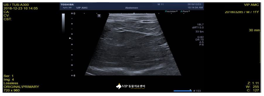 고양이 용식이의 초음파 검사 상에서는 간 크기 증가, 간 에코의 전반적인 상승이 확인되었습니다. 췌장, 담낭 등은 특이사항없이 양호하였습니다.