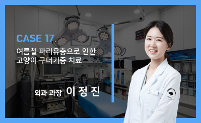 고양이 발톱주위염증(paronychia) 치료고양이 발톱주위염증(paronychia) 치료청담점 내과 과장 정이경│ 내원이유5년령 중성화 고양이로 만성적으로 존재하던 발톱 주위 염증이 한 달 전부터 심해져서 보호자님과 함께 내원하시게 되었습니다. 보호자님 관찰에 따르면 발톱 주변 살이 빨개지고 녹색, 노란색 농이 생겨 지속적으로 핥고 불편해했다고 합니다. 병변 관찰 시 고양이 발톱 주위 염증(Paronychia, nail bed infection)이 의심되었습니다. │ 진행된 검사 1. 신체검사 - 전후지 발가락 끝 여러 곳에 부종과 발적이 관찰되었습니다. - 발톱 주름과 발톱 뿌리 부분이 만나는 곳에 끈적끈적한 녹색 농이 쌓여 있었습니다. - 해당 부위 촉진시 통증을 호소 하였습니다. - 이외 다른 피부 병변은 보이지 않았습니다. 2. 현미경검사 - 병변의 농성 삼출물을 도말하여 현미경으로 관찰한 결과, 다량의 퇴행성 호중구와 세균들이 관찰되었습니다. 3. 배양검사 │ 의료진 소견 & 치료고양이 발톱주위 염증의 경우 세균 감염, 곰팡이 감염에 의해 발생할 수 있으며 자가면역 질환의 일환으로 발생하기도 합니다. 해부학적 특성상 따뜻하고 습한 부위로 한 번 염증이 발생하면 개선이 잘 되지 않는 특징이 있으며 일반 피부염보다 장기간 약물 투여가 필요합니다. 배양검사를 통한 원인체 감별과 적절한 항생제/항진균제 사용, 철저한 소독과 환기가 필요하며 면역 매개 질환이 의심되는 경우 면역억압 치료가 필요할 수도 있습니다.본 환자의 경우 배양검사를 통해 두 종류의 세균이 검출되었습니다. 두 종류의 세균 모두 동물의 분변에서 흔하게 발견되는 세균으로 기회감염을 통해 발톱주위 염증을 일으킨 것으로 판단되었습니다. 항생제 감수성 결과를 바탕으로 한 내복약 투약과 가정 내 발톱 소독을 처방하였고 그루밍 자극에 의한 악화를 막기 위해 넥타라를 착용하고 지내도록 하였습니다. │ 치료 후 경과치료 전 치료 후 약 한달간 치료 진행 후 발톱 주위에 있던 부종과 염증이 거의 개선된 것을 확인할 수 있었으며 지속적으로 발을 핥던 불편감도 사라져 보호자님께서 만족하셨습니다.